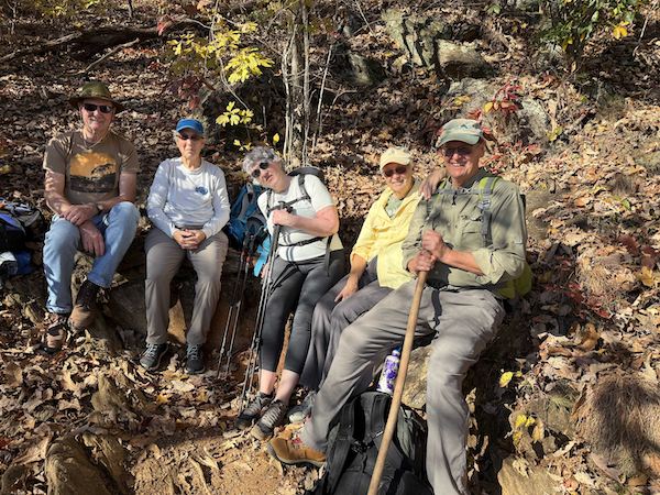 Rosemary, our indefatigable octogenarian, was a bit slow-paced, due to age and fairly recent hip problems. She hiked with us several weeks ago in the Chattanooga area, so we all knew she would arrive a bit late, but she and the rest of us kinda underestimated just how long it would take her and Terry to make the hike.